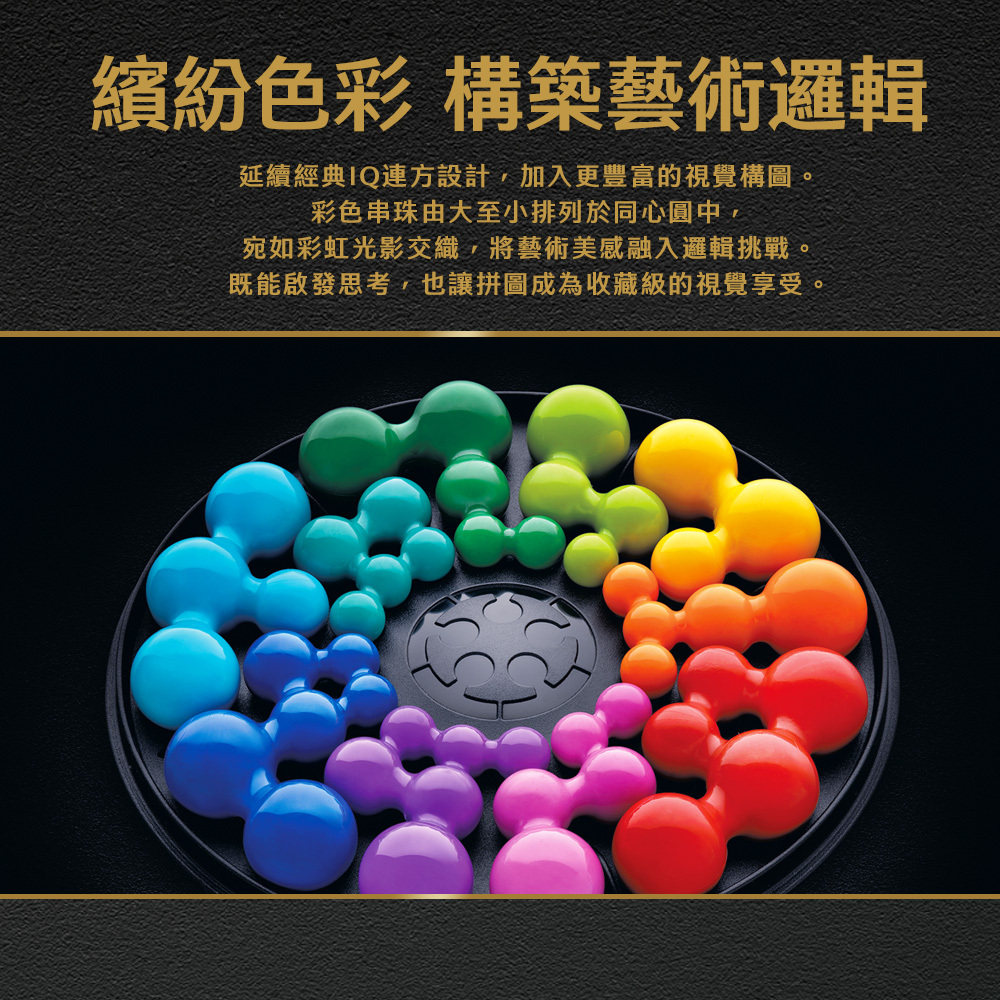 延續經典IQ連方結構,加入更豐富的視覺變化。彩色串珠以大小漸層排列於同心圓中,宛如彩虹光影交織,讓玩家在挑戰邏輯的同時,也感受藝術構圖的平衡與美感。