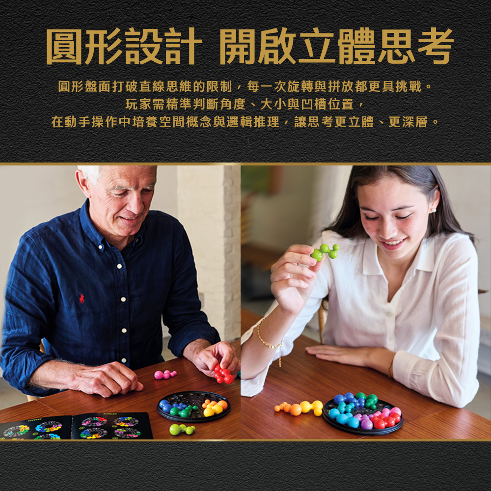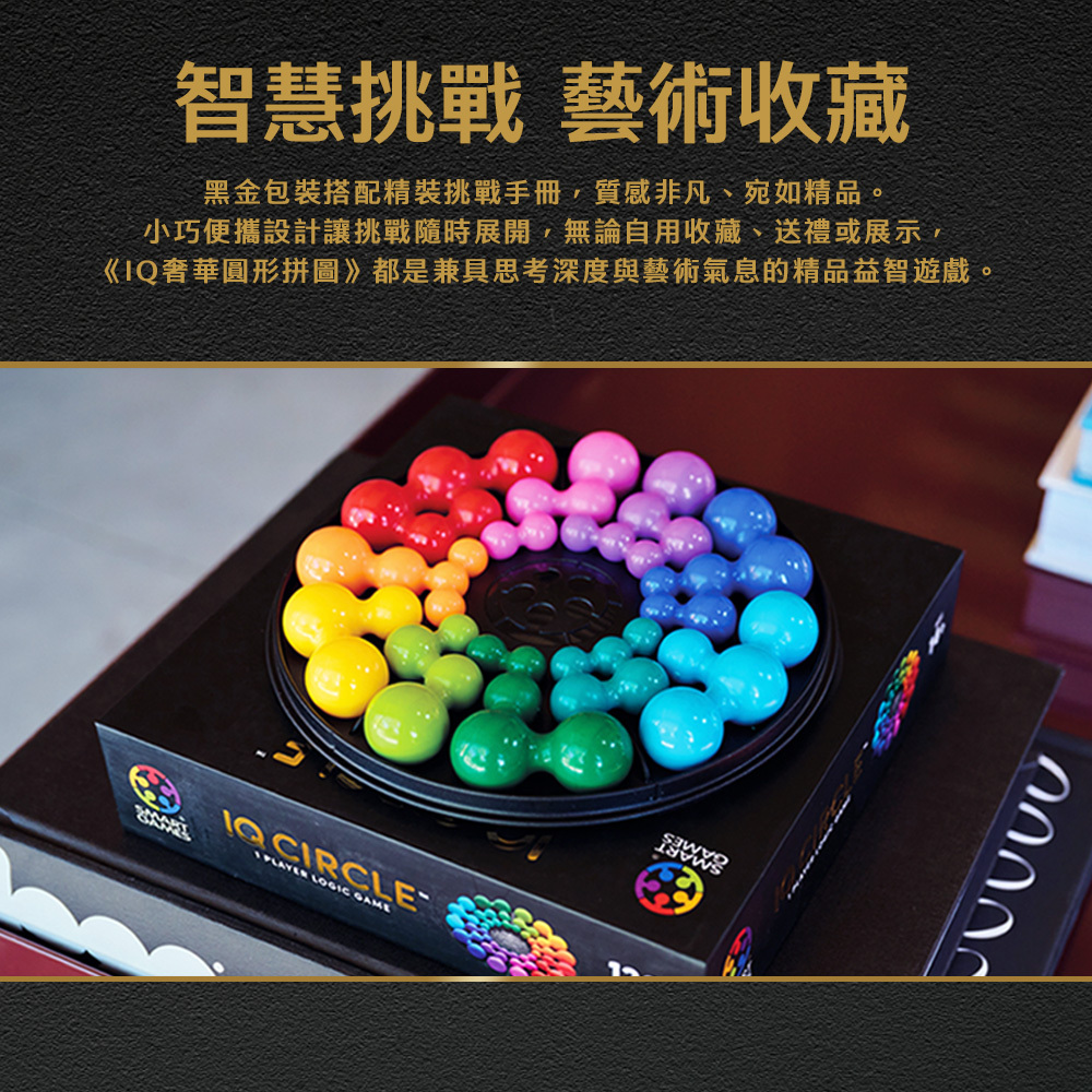 來自比利時SmartGames的極致之作《IQ奢華圓形拼圖》,將邏輯挑戰與藝術美感完美融合。黑金包裝與絢麗同心圓設計,宛如收藏級藝術品。內含120道挑戰關卡,每一次拼放都是腦力與美學的極致享受。推薦給喜愛質感生活的大人玩家!
