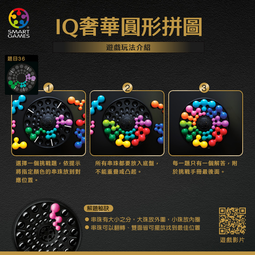 《IQ奢華圓形拼圖》除了原有IQ基礎的連方設計,彩色串珠由大至小排列,以同心圓設計融入視覺美學,展現智慧與藝術交織的光彩。高質感黑金包裝搭配精裝手冊,收藏與攜帶兼具,讓玩家隨時展開一場優雅的思考旅程。