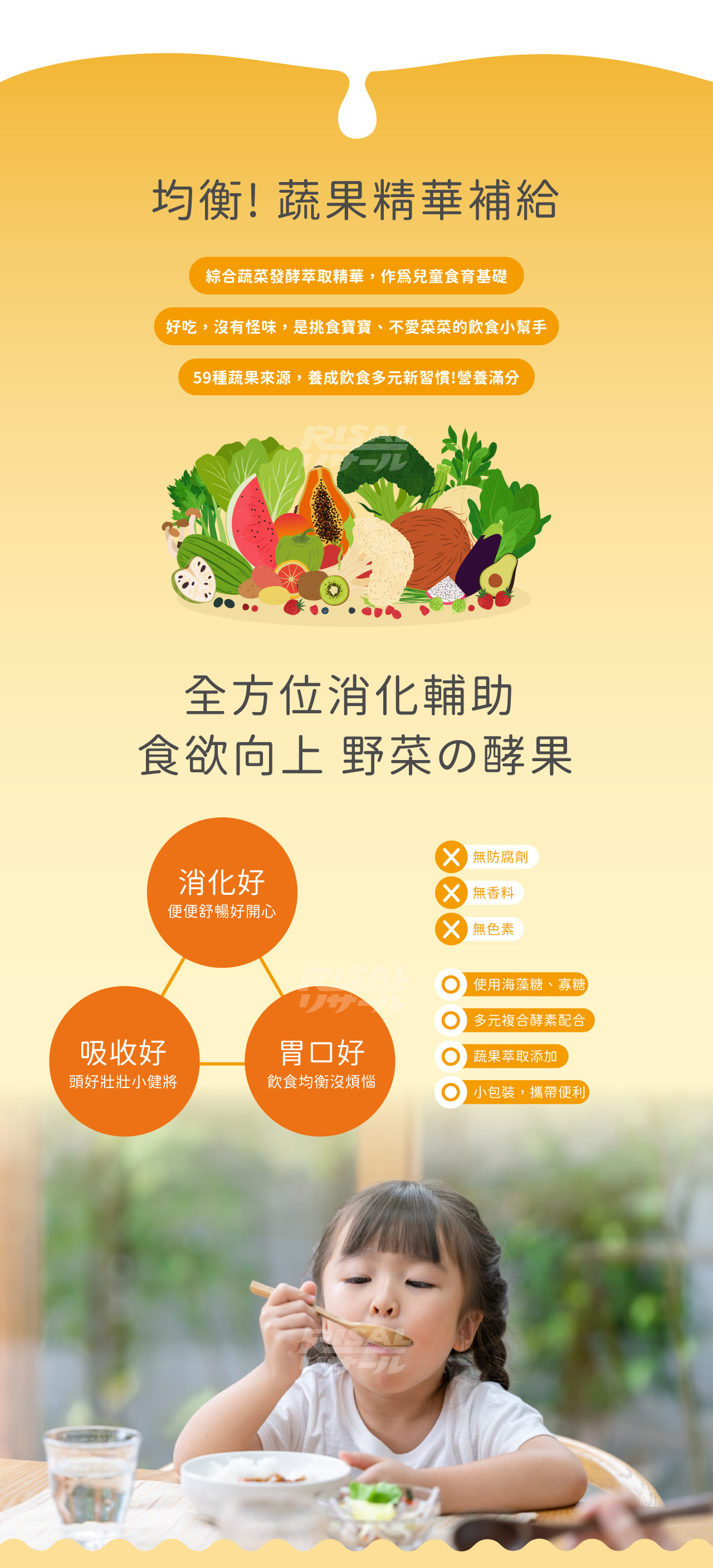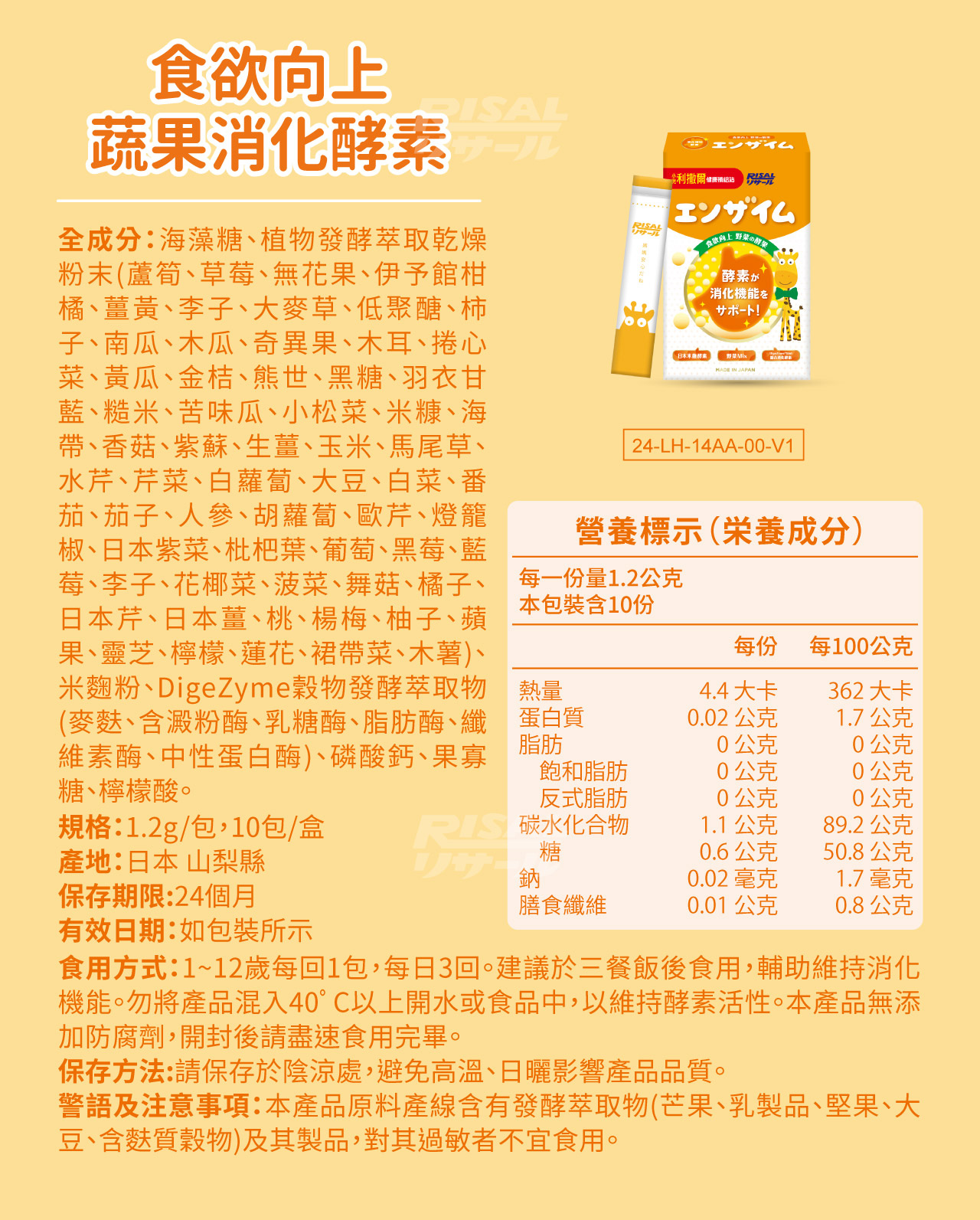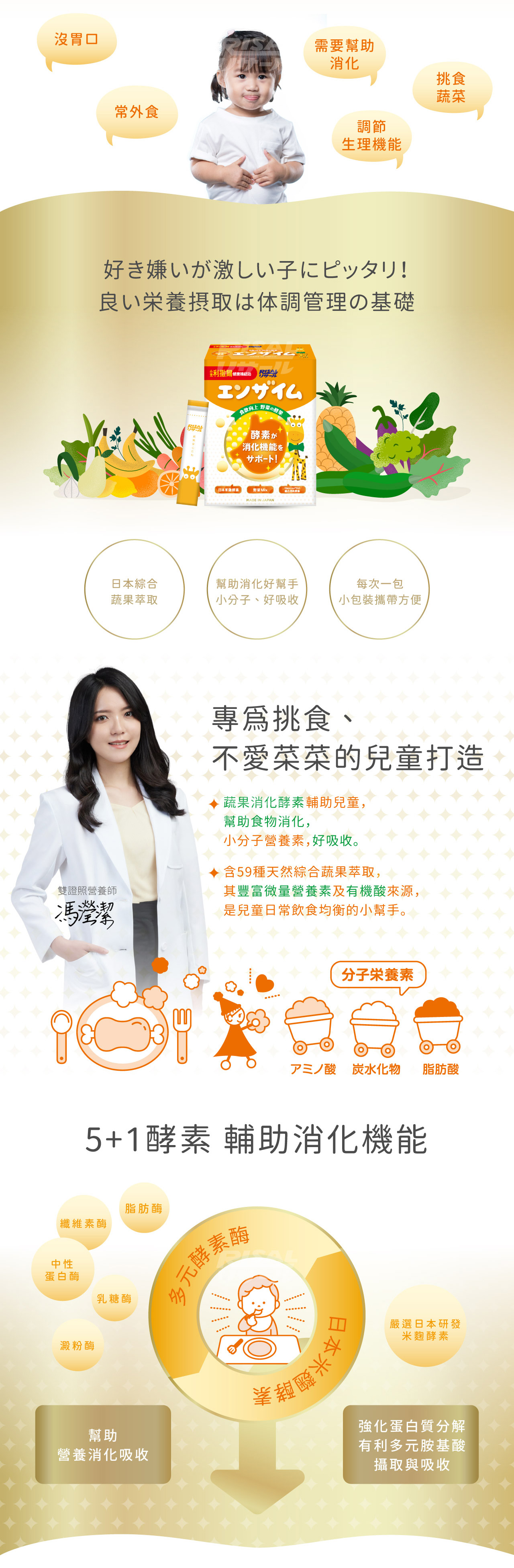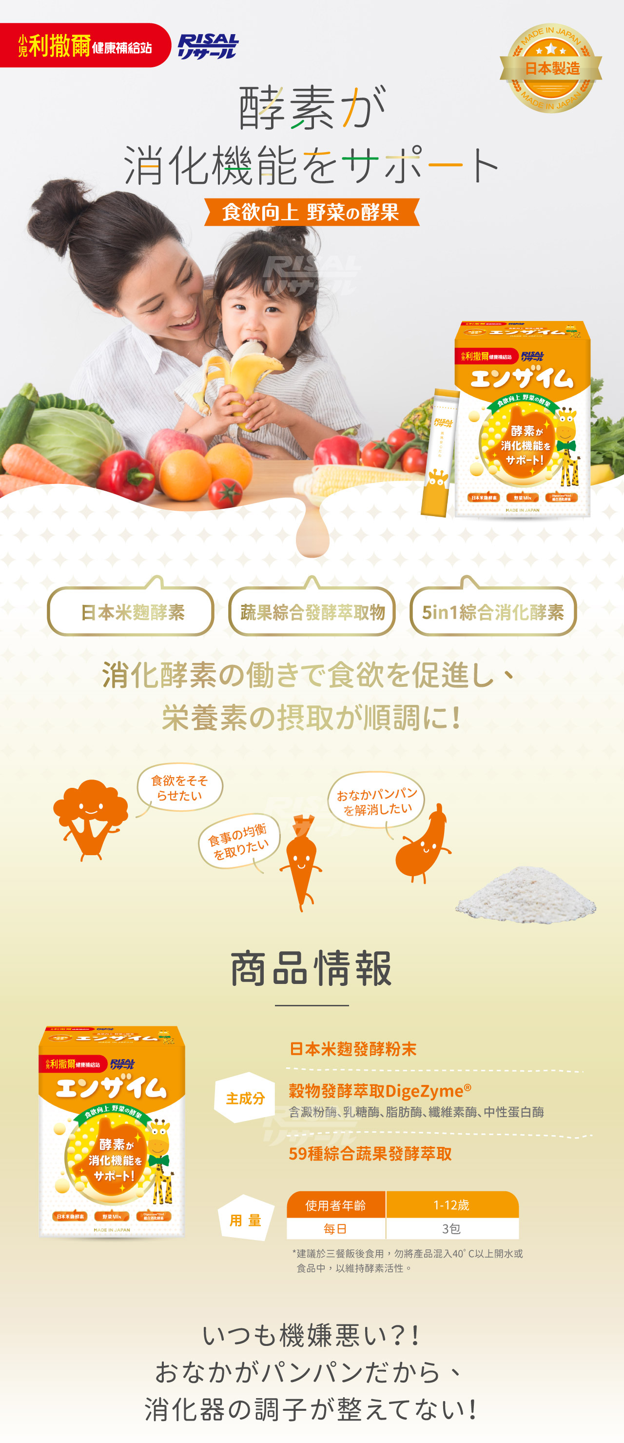 1到12歲每回1包,每日3回。建議於三餐飯後食用,輔助維持消化機能。本產品無添加防腐劑,開封後請盡速食用完畢。勿將產品混入40゚C以上開水或食品中,以維持酵素活性。