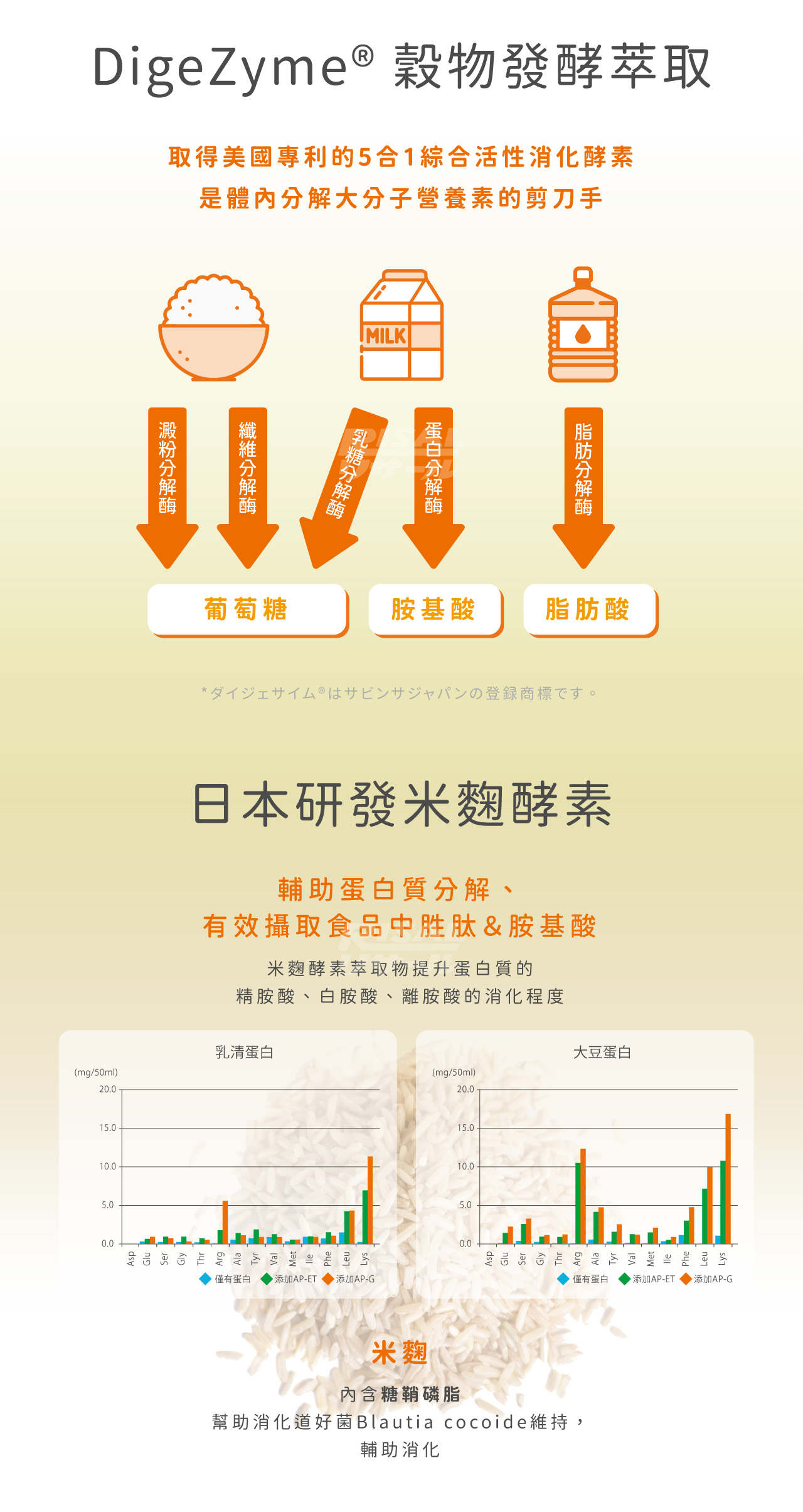 海藻糖、植物發酵萃取乾燥粉末糊精、植物發酵物昆布、海藻、海苔、高麗菜、地瓜、松茸、蓮藕、牛蒡、番茄、青椒、甜菜、紅椒、紅蘿蔔、白蘿蔔、藜麥、玄米、燕麥、玉蜀黍、大麥、豌豆、紅豆、巴西豆、紫巴西豆、黑芝麻、黃豆、黑巴西豆、鷹嘴豆、小扁豆、薏苡、乾玉米、棉籽油、迷迭香、明日葉、黑醋栗、檸檬草、肉桂、甜菊葉、瓜拿那、橘子、鳳梨、香蕉、蘋果、青木瓜、芭樂,哈密瓜、酪梨、黑棗乾,西印度櫻桃、葡萄乾、芒果、楊桃,西瓜,奇異果,西洋梨、卡姆果、米麴發酵粉末、穀物發酵萃取DigeZyme® 穀物發酵萃取物麥麩,含澱粉酶、乳糖酶、脂肪酶、纖維素酶、中性蛋白酶 、麥芽糊精、磷酸鈣、果寡糖、檸檬酸