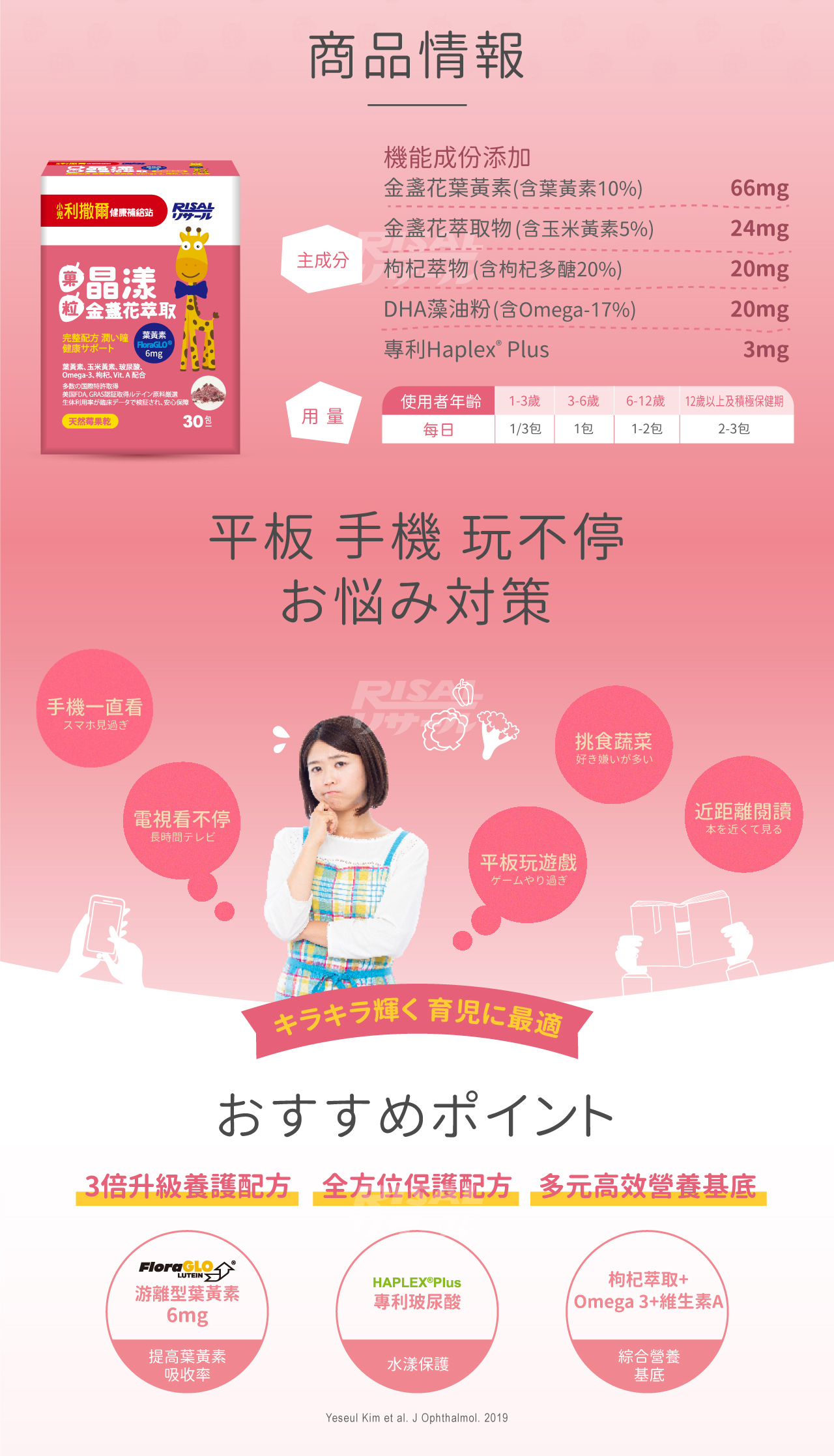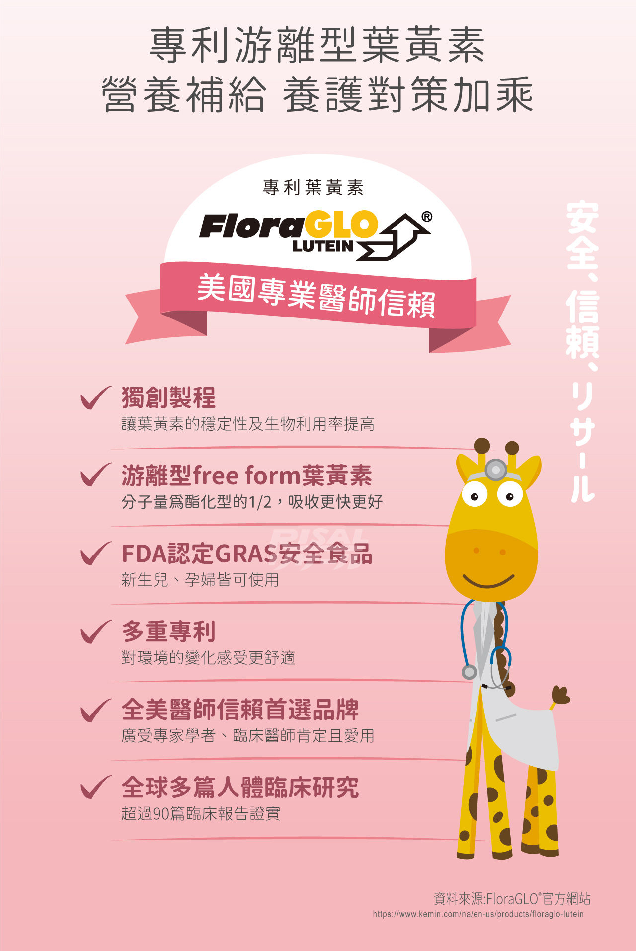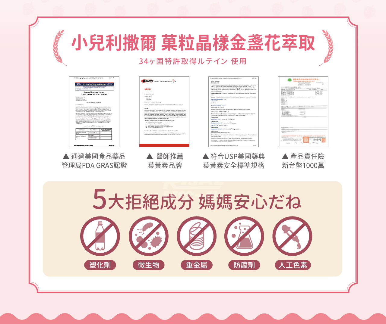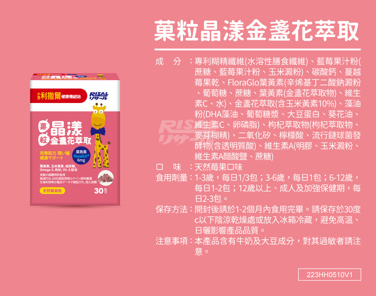 專利糊精纖維(水溶性膳食纖維)、藍莓果汁粉(蔗糖、藍莓果汁粉、玉米澱粉)、碳酸鈣、蔓越莓果乾、FloraGlo葉黃素(辛烯基丁二酸鈉澱粉、葡萄糖、蔗糖、葉黃素(金盞花萃取物)、維生素C、水)、金盞花萃取(含玉米黃素10%)、藻油粉(DHA藻油、葡萄糖漿、大豆蛋白、葵花油、維生素C、卵磷脂)、枸杞萃取物(枸杞萃取物、麥芽糊精)、二氧化矽、檸檬酸、流行鏈球菌發酵物(含透明質酸)、維生素A(明膠、玉米澱粉、維生素A醋酸鹽、蔗糖)