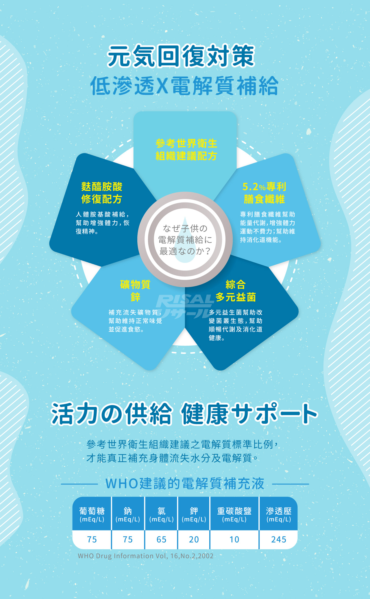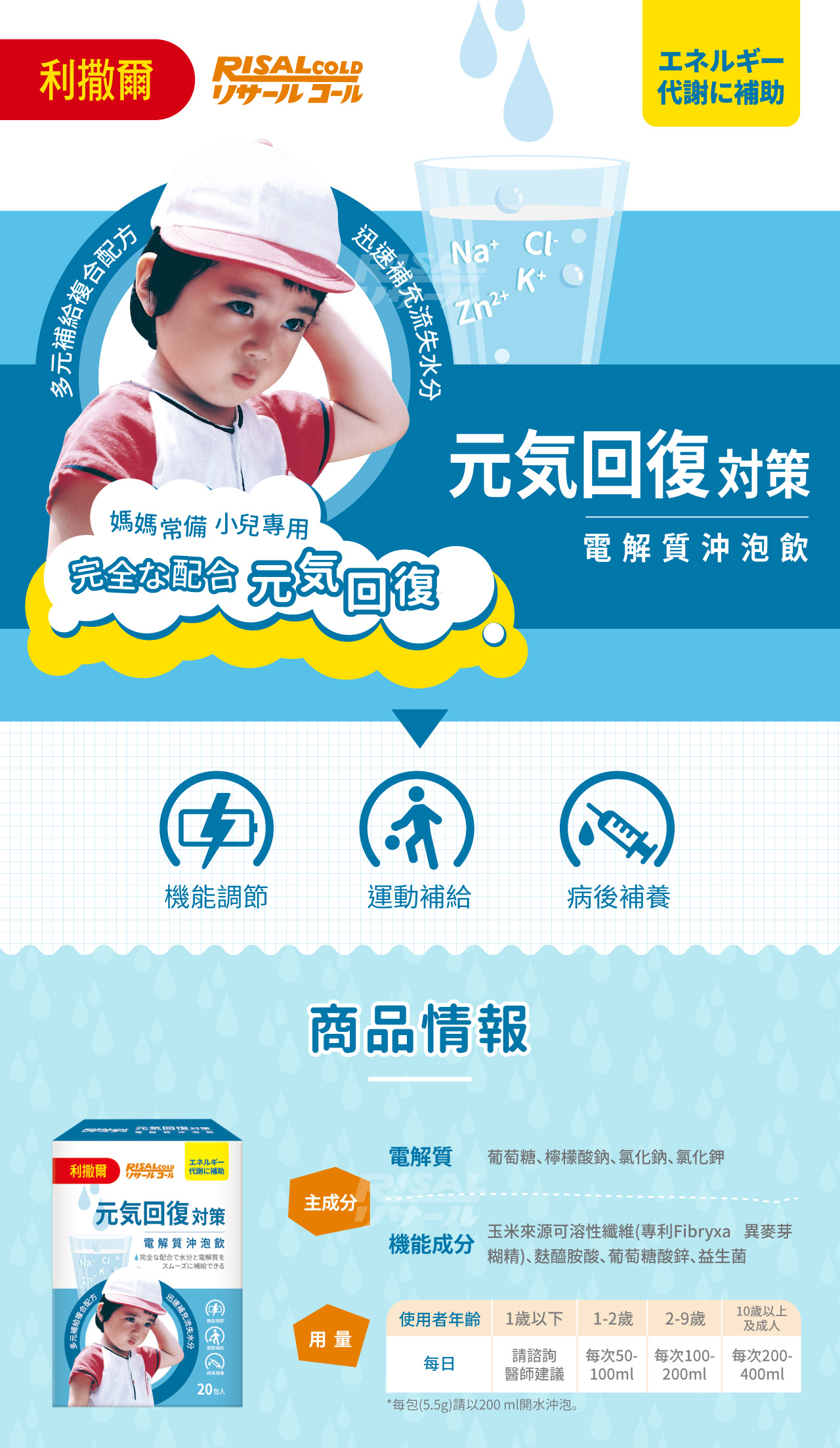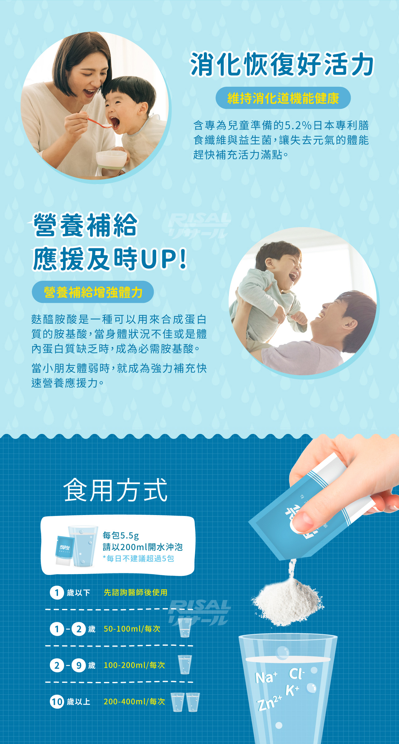 每包5.5g請以200ml開水沖泡。請以需求補充,每日建議不超過5包。一歲以下嬰兒,請先諮詢醫師建議後使用。一至兩歲兒童,建議每次給予50至100 ml補充;二至九歲兒童,建議每次給予100至200 ml補充;十歲以上兒童及成人,每次200至400 ml補充。