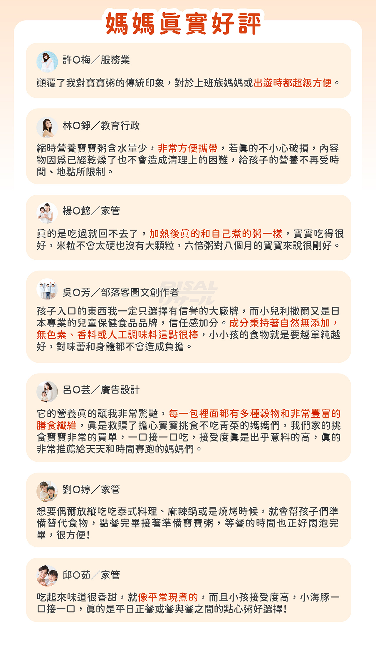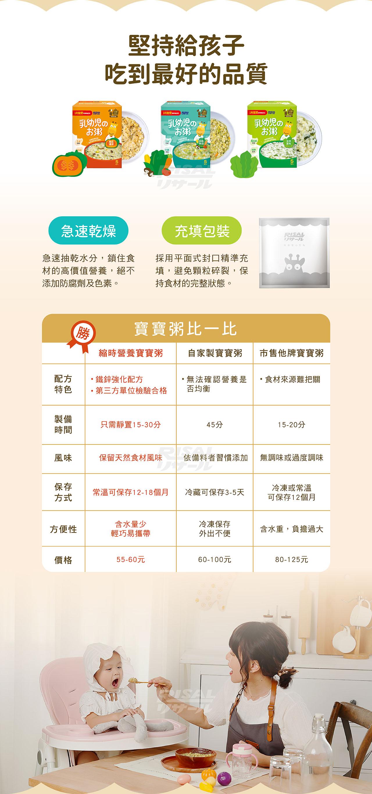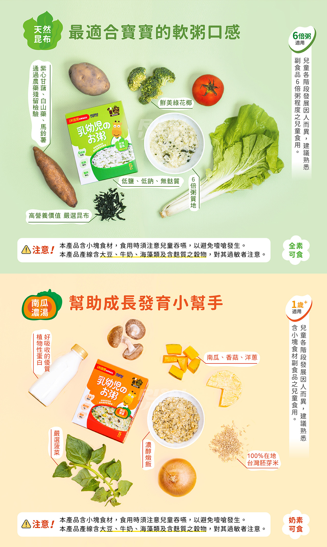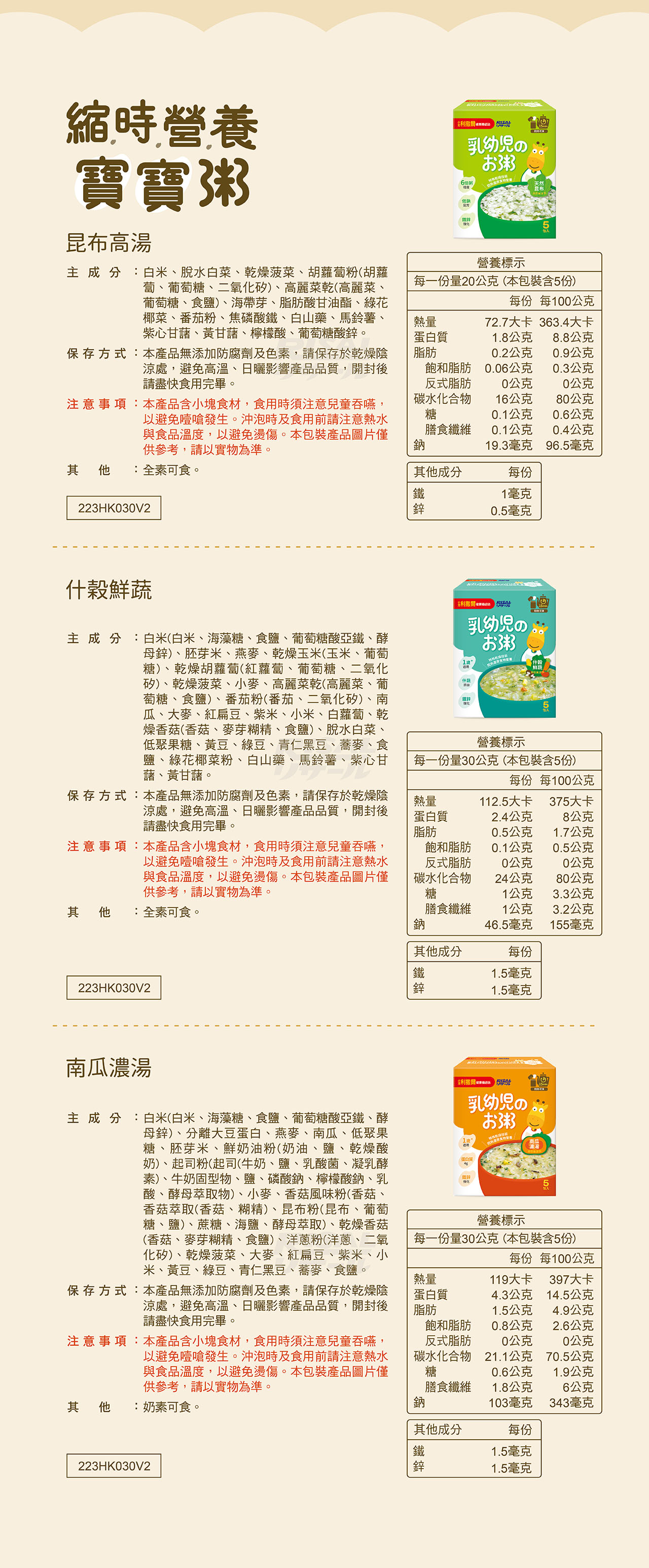 白米白米、海藻糖、食鹽、葡萄糖酸亞鐵、酵母鋅、分離大豆蛋白、燕麥、南瓜、低聚果糖、胚芽米、鮮奶油粉奶油、鹽、乾燥酸奶、起司粉起司牛奶、鹽、乳酸菌、凝乳酵素、牛奶固型物、鹽、磷酸鈉、檸檬酸鈉、乳酸、酵母萃取物、小麥、香菇風味粉香菇、香菇萃取香菇、糊精、昆布粉昆布、葡萄糖、鹽、蔗糖、海鹽、酵母萃取、乾燥香菇香菇、麥芽糊精、食鹽、洋蔥粉洋蔥、二氧化矽、乾燥菠菜、大麥、紅扁豆、紫米、小米、 黃豆、綠豆、青仁黑豆、蕎麥、食鹽。