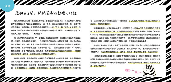 讓孩子學會「嘗試與探索」 噗噗和每個孩子一樣,對世界充滿好奇。在荒誕又奇妙的冒險中,他吃花、吞洗衣機、咬大樓,甚至一口吞下月亮。這些行為看似搞笑,其實暗示了孩子探索世界、理解界限、建立自我的心理過程。透過故事,孩子能在想像與幽默中學會勇敢嘗試,也學會尊重自己的創意與獨特性。 專為孩子心理與創造力量身打造 《斑馬噗噗與魔法條紋》不是單純的搞笑故事書,而是以孩子容易理解的奇妙情節與強烈視覺設計,呈現「自主 vs. 羞怯」、「混亂與秩序」、「想像與現實」等心理探索概念。書中每一次噗噗的嘗試、每一次大膽的行徑,都是孩子學習自我表達與創造力的縮影,幫助孩子在閱讀中養成探索、思考與創造的能力。