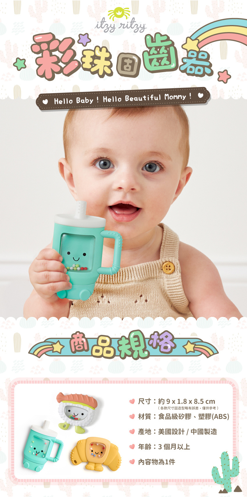Itzy Ritzy 彩珠固齒器,立體可愛造型搭配繽紛配色,吸引寶寶目光。內含彩珠搖鈴,聲音刺激感官發展。柔軟安全材質舒緩長牙不適,方便小手抓握。輕巧好攜帶,通過 ASTM F963 認證,讓寶寶安心咬咬、快樂成長。