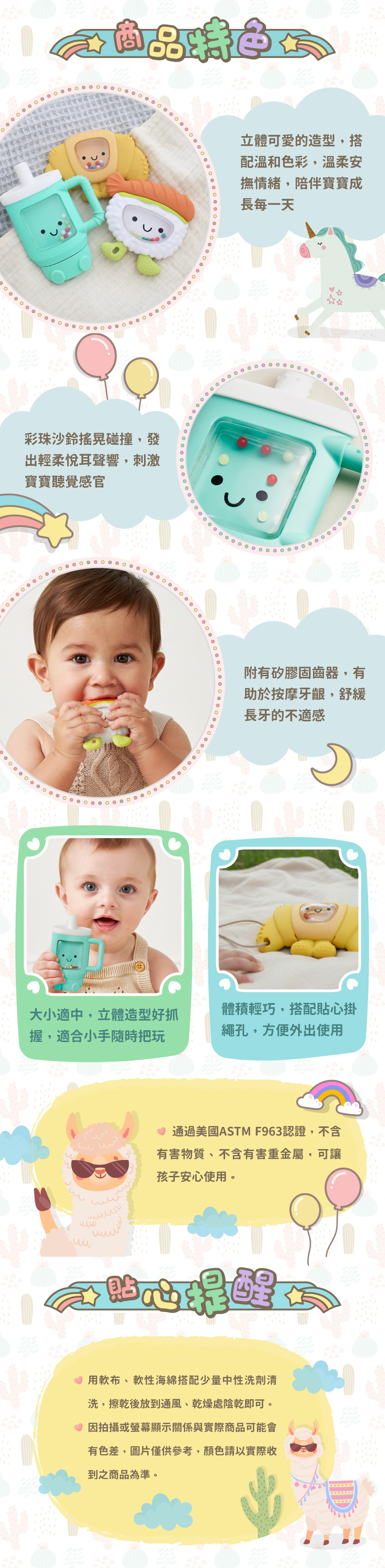 ● 內含彩珠搖鈴設計,發出聲響增添樂趣,刺激聽覺與感官發展