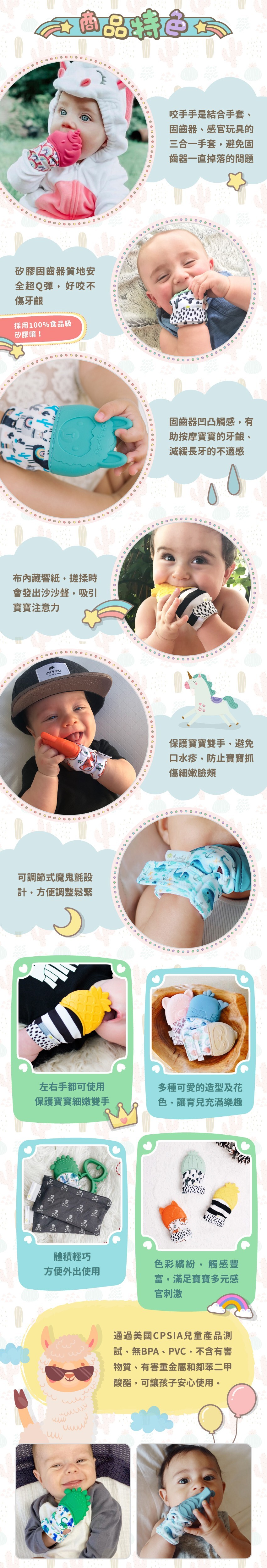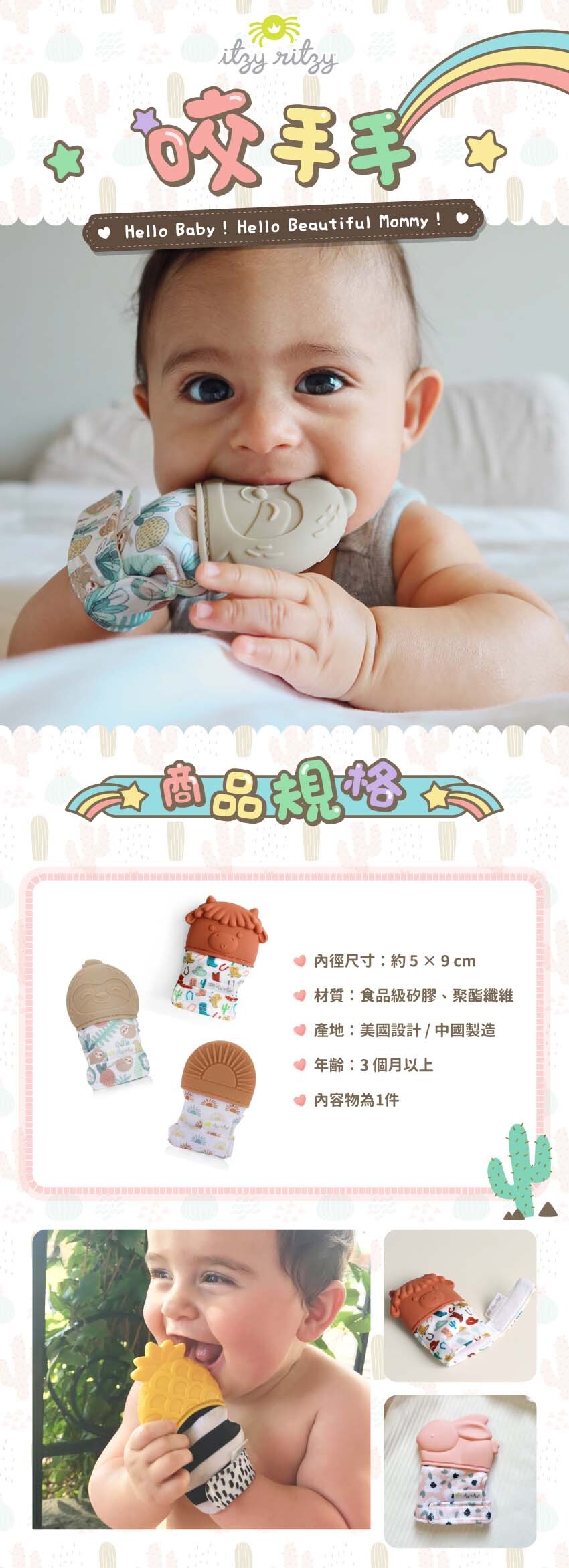 美國Itzy Ritzy 咬手手矽膠固齒器質地安全超Q彈,好咬不傷牙齦、固齒器凹凸觸感、布內藏響紙會發出沙沙聲,可調節式魔鬼氈設計,方便調整鬆緊