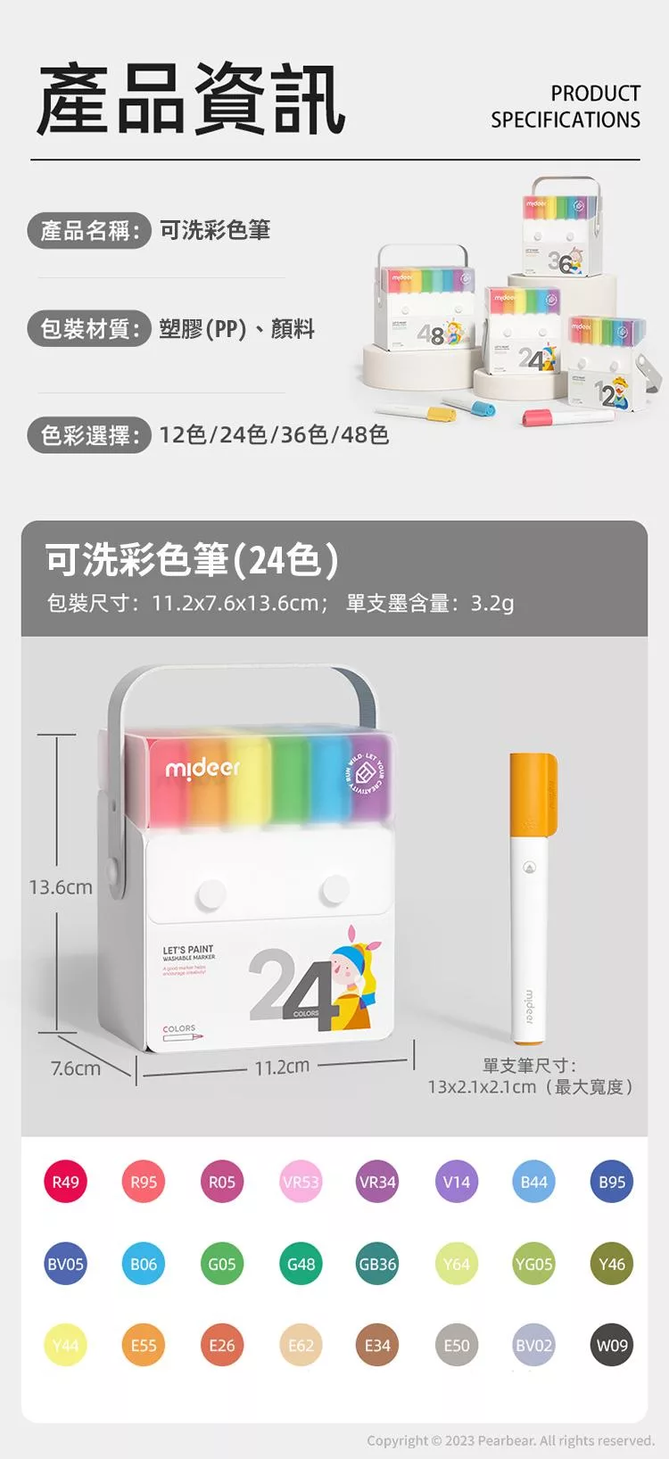 可洗彩色筆是一系列非常適合孩子創作的水性彩色筆,擁有亮麗的彩虹配色,可以啟動孩子對色彩的感知力。不僅色彩飽滿不褪色,還可用清水輕鬆清洗顏料,不怕孩子的「即興創作」!水洗度創新高!從墨水到筆桿全面專為兒童繪畫研發。全新的安全墨水,通過國外認證的各項檢測,確保使用安心,給孩子安全保障。其中96.5%的顏色都可以輕鬆溶解,不留痕跡。該配方經過全新水洗墨研發,可在溫水下獲得更高的水洗度,衣物和皮膚都可以輕鬆清洗乾淨。“口紅”筆頭點、線、面輕鬆切換,一支筆體現多種繪畫技巧。“口紅”筆頭:更符合3-6歲兒童繪畫握筆角度與力度,點、線、面,輕鬆創作。這款筆通過了“UL環境聲明驗證”,所使用的材質對環境友善,通過綠色環保檢測。此外,這款筆的墨量高出標準4倍,一支可以多畫300公尺!加大筆芯筆頭接觸面,出墨流暢均勻,一筆順滑到底。漸變粗三角筆桿:為正確握筆姿勢訂製,筆桿採用三角到圓桿漸變設計,重心偏下更好引導正確握筆姿勢。這款筆的色彩體系是由大師級藝術家配色,結合明度及色相進行細分,以兒童繪畫習慣及顏色認知為基準,建構Mideer大師級色彩體系。筆芯具有高抗壓特性,大力戳也不易內縮。筆帽採用21 mm大直徑設計,透氣防窒息。雙重防護,全方位守護孩子用筆安全,符合學生用品安全通用要求。還有更多用心細節,如彩旗筆帽防滑落、分格存放好拿取、筆帽輕鬆拔、筆芯密封防墨乾等。外包裝擁有手提盒、筆筒、收納功能,非常實用。