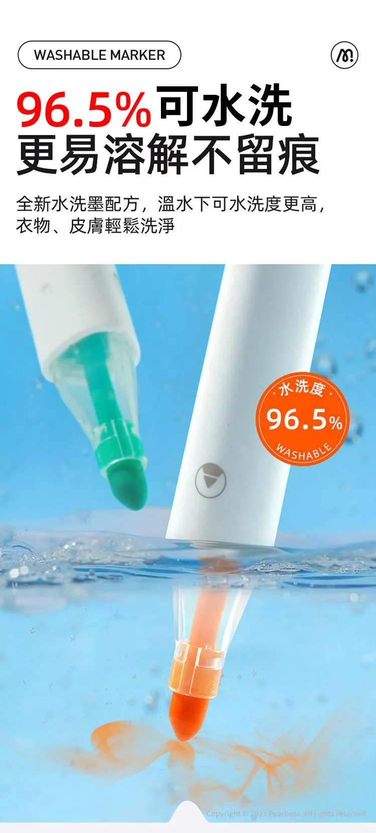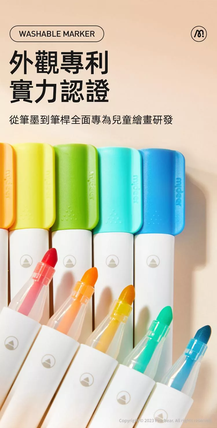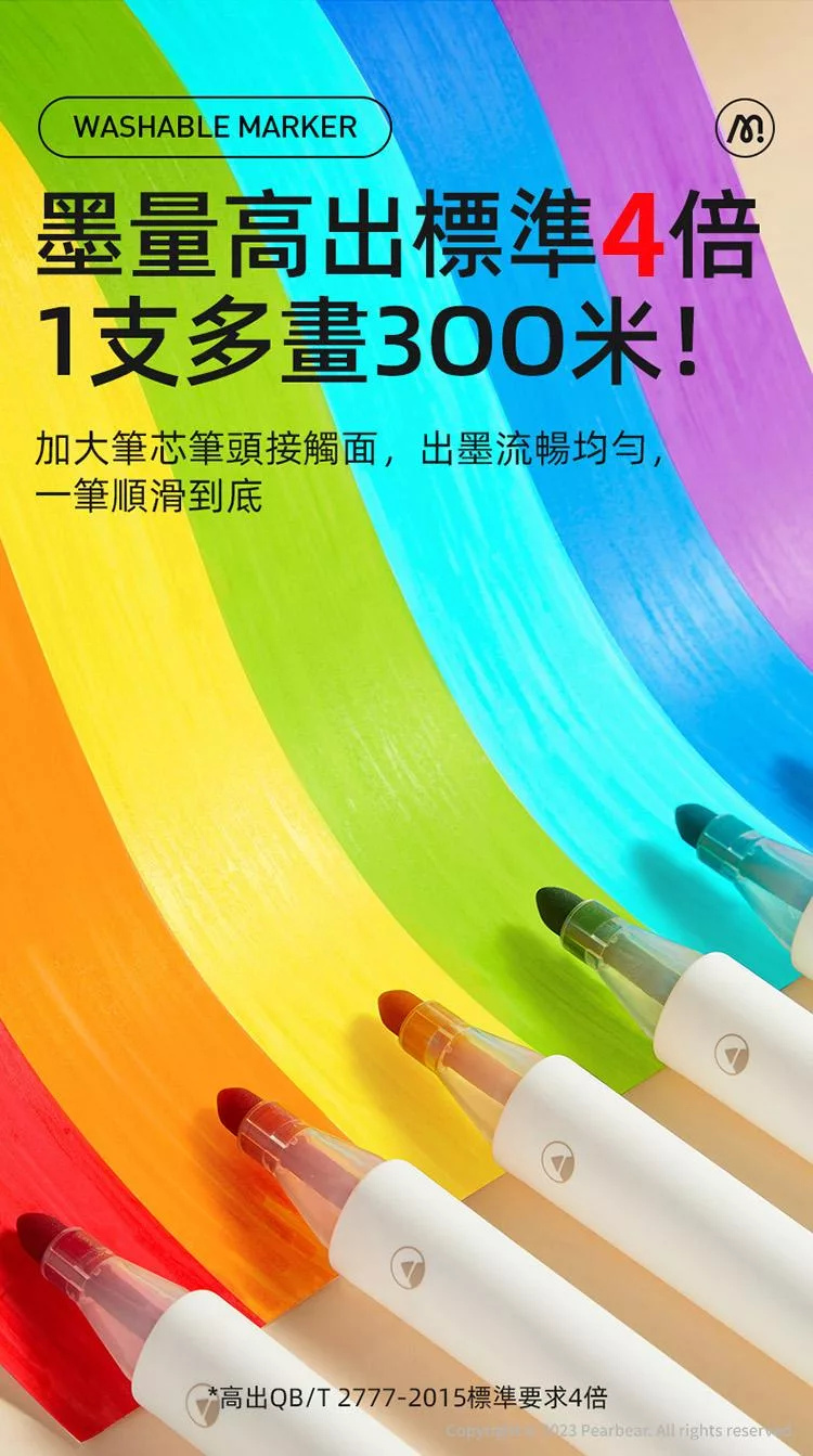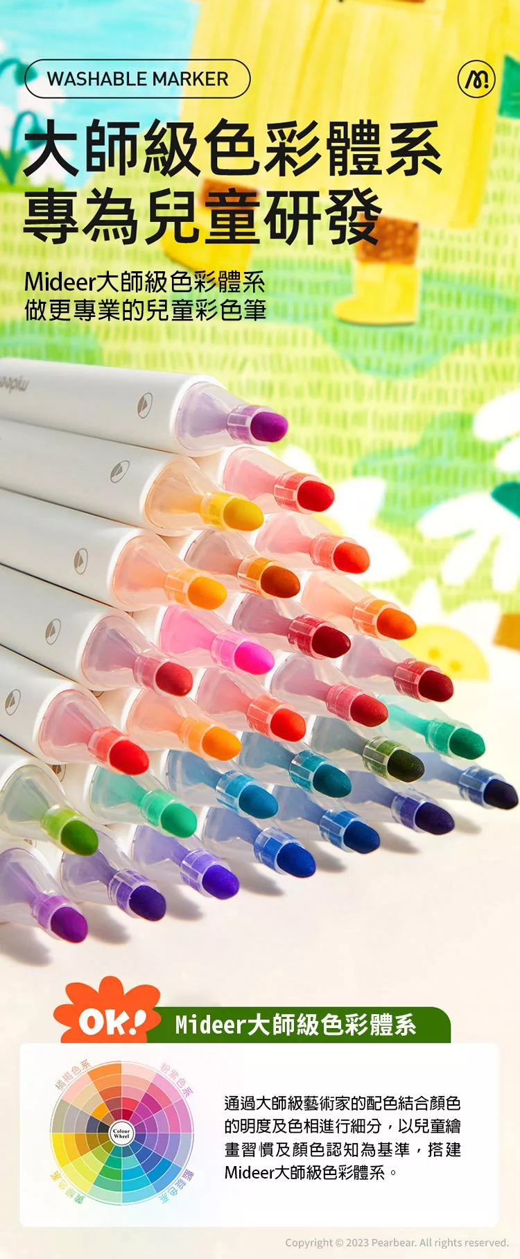 可洗彩色筆是一系列非常適合孩子創作的水性彩色筆,擁有亮麗的彩虹配色,可以啟動孩子對色彩的感知力。不僅色彩飽滿不褪色,還可用清水輕鬆清洗顏料,不怕孩子的「即興創作」!水洗度創新高!從墨水到筆桿全面專為兒童繪畫研發。全新的安全墨水,通過國外認證的各項檢測,確保使用安心,給孩子安全保障。其中96.5%的顏色都可以輕鬆溶解,不留痕跡。該配方經過全新水洗墨研發,可在溫水下獲得更高的水洗度,衣物和皮膚都可以輕鬆清洗乾淨。“口紅”筆頭點、線、面輕鬆切換,一支筆體現多種繪畫技巧。“口紅”筆頭:更符合3-6歲兒童繪畫握筆角度與力度,點、線、面,輕鬆創作。這款筆通過了“UL環境聲明驗證”,所使用的材質對環境友善,通過綠色環保檢測。此外,這款筆的墨量高出標準4倍,一支可以多畫300公尺!加大筆芯筆頭接觸面,出墨流暢均勻,一筆順滑到底。漸變粗三角筆桿:為正確握筆姿勢訂製,筆桿採用三角到圓桿漸變設計,重心偏下更好引導正確握筆姿勢。這款筆的色彩體系是由大師級藝術家配色,結合明度及色相進行細分,以兒童繪畫習慣及顏色認知為基準,建構Mideer大師級色彩體系。筆芯具有高抗壓特性,大力戳也不易內縮。筆帽採用21 mm大直徑設計,透氣防窒息。雙重防護,全方位守護孩子用筆安全,符合學生用品安全通用要求。還有更多用心細節,如彩旗筆帽防滑落、分格存放好拿取、筆帽輕鬆拔、筆芯密封防墨乾等。外包裝擁有手提盒、筆筒、收納功能,非常實用。