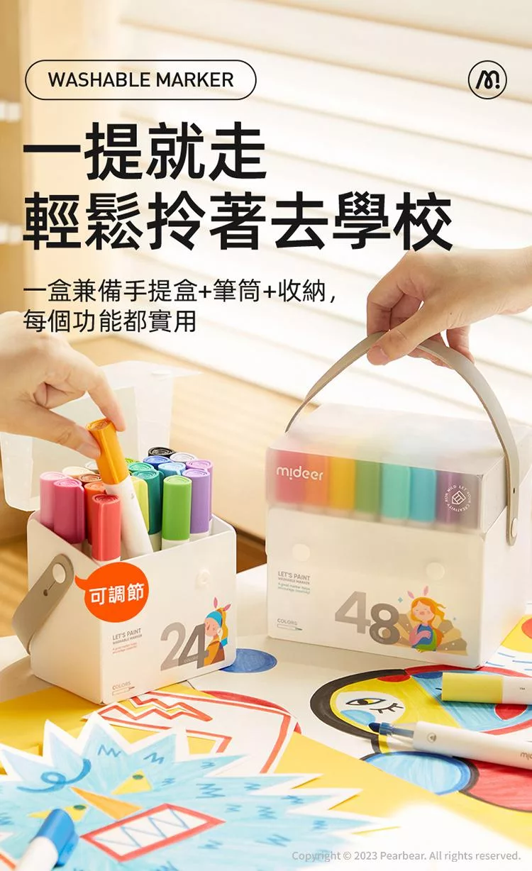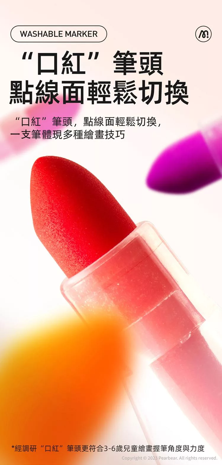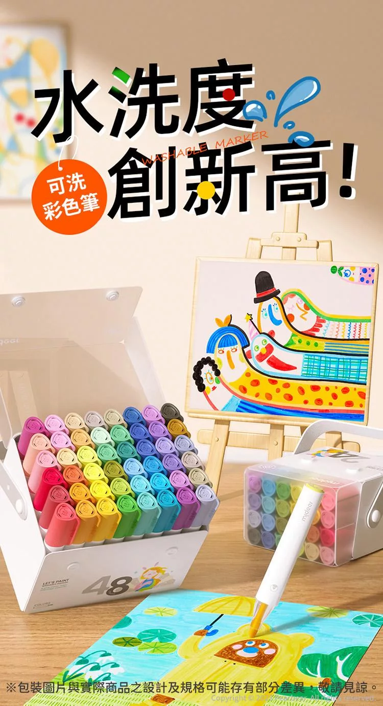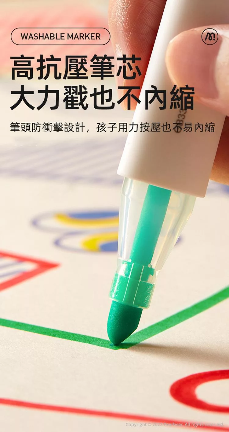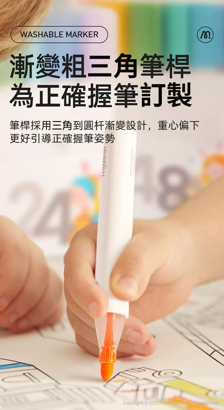 可洗彩色筆是一系列非常適合孩子創作的水性彩色筆,擁有亮麗的彩虹配色,可以啟動孩子對色彩的感知力。不僅色彩飽滿不褪色,還可用清水輕鬆清洗顏料,不怕孩子的「即興創作」!水洗度創新高!從墨水到筆桿全面專為兒童繪畫研發。全新的安全墨水,通過國外認證的各項檢測,確保使用安心,給孩子安全保障。其中96.5%的顏色都可以輕鬆溶解,不留痕跡。該配方經過全新水洗墨研發,可在溫水下獲得更高的水洗度,衣物和皮膚都可以輕鬆清洗乾淨。“口紅”筆頭點、線、面輕鬆切換,一支筆體現多種繪畫技巧。“口紅”筆頭:更符合3-6歲兒童繪畫握筆角度與力度,點、線、面,輕鬆創作。這款筆通過了“UL環境聲明驗證”,所使用的材質對環境友善,通過綠色環保檢測。此外,這款筆的墨量高出標準4倍,一支可以多畫300公尺!加大筆芯筆頭接觸面,出墨流暢均勻,一筆順滑到底。漸變粗三角筆桿:為正確握筆姿勢訂製,筆桿採用三角到圓桿漸變設計,重心偏下更好引導正確握筆姿勢。這款筆的色彩體系是由大師級藝術家配色,結合明度及色相進行細分,以兒童繪畫習慣及顏色認知為基準,建構Mideer大師級色彩體系。筆芯具有高抗壓特性,大力戳也不易內縮。筆帽採用21 mm大直徑設計,透氣防窒息。雙重防護,全方位守護孩子用筆安全,符合學生用品安全通用要求。還有更多用心細節,如彩旗筆帽防滑落、分格存放好拿取、筆帽輕鬆拔、筆芯密封防墨乾等。外包裝擁有手提盒、筆筒、收納功能,非常實用。