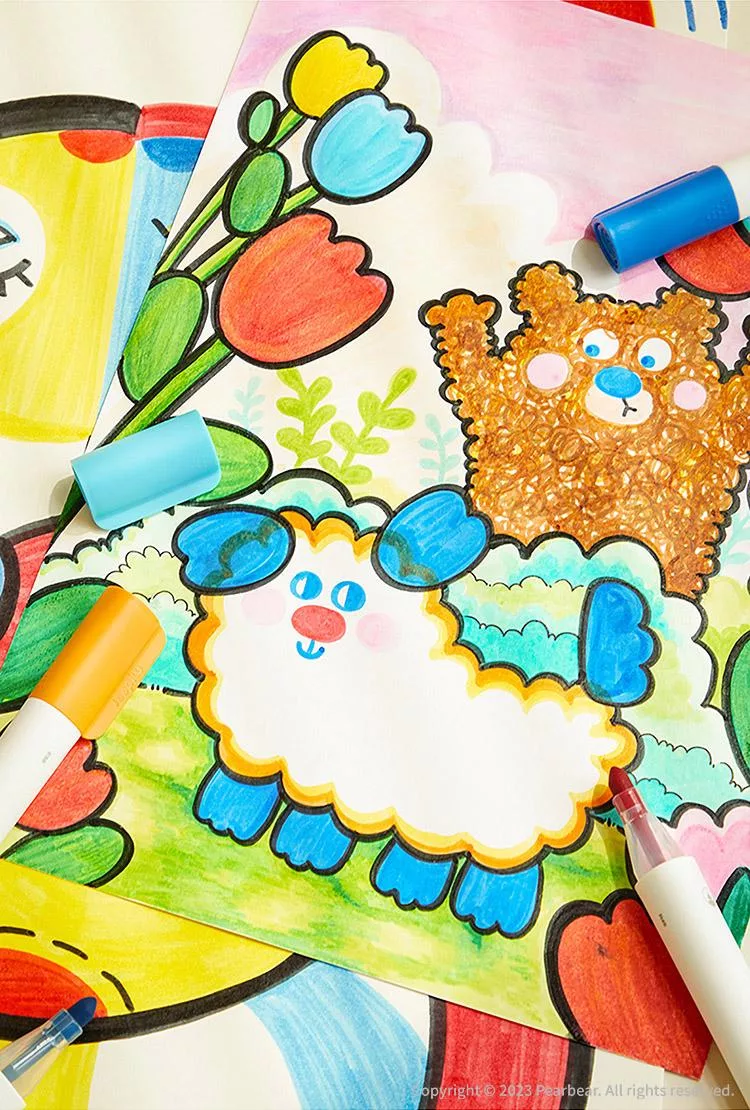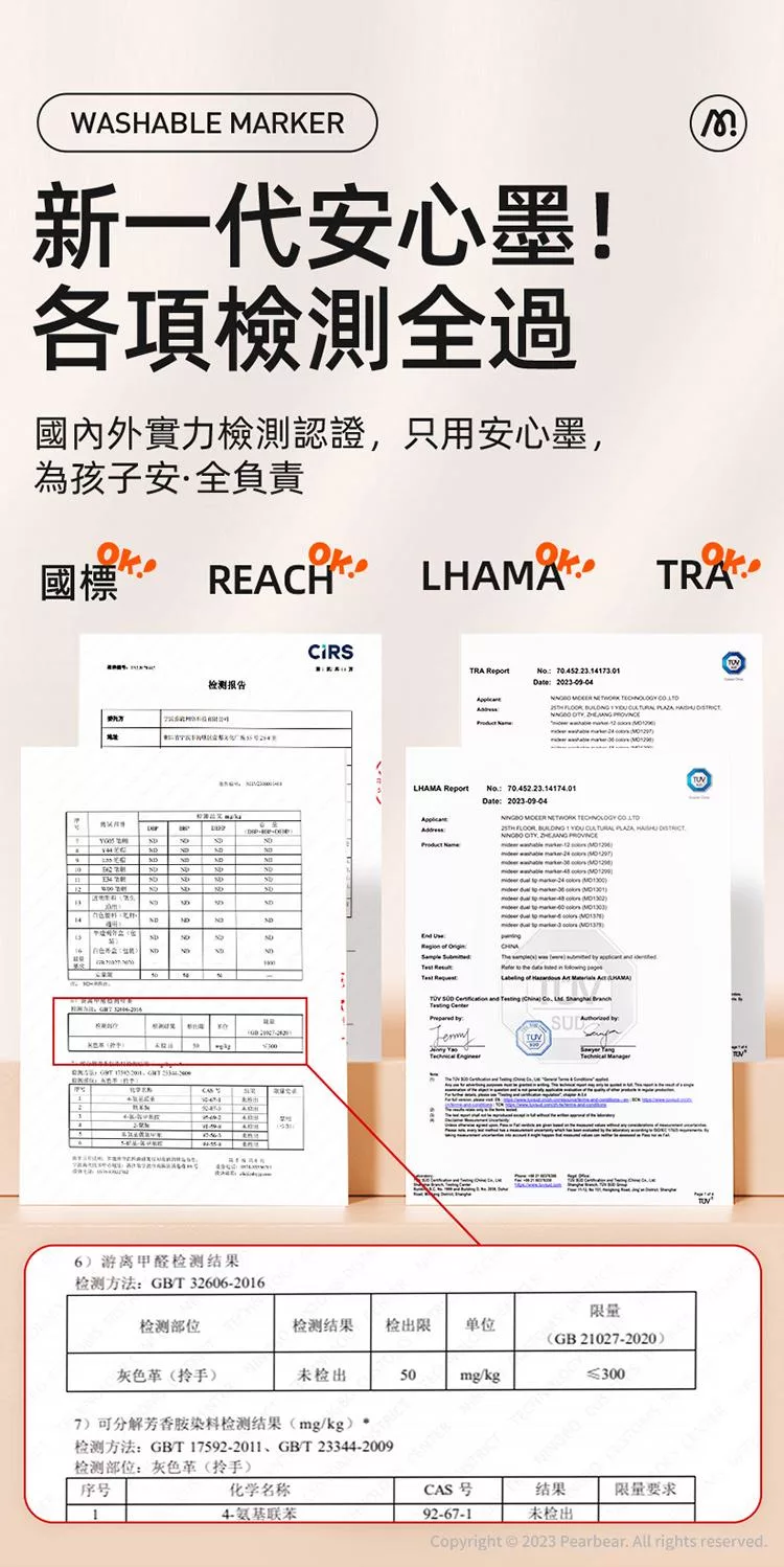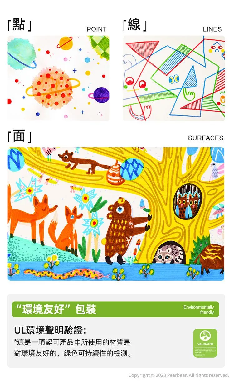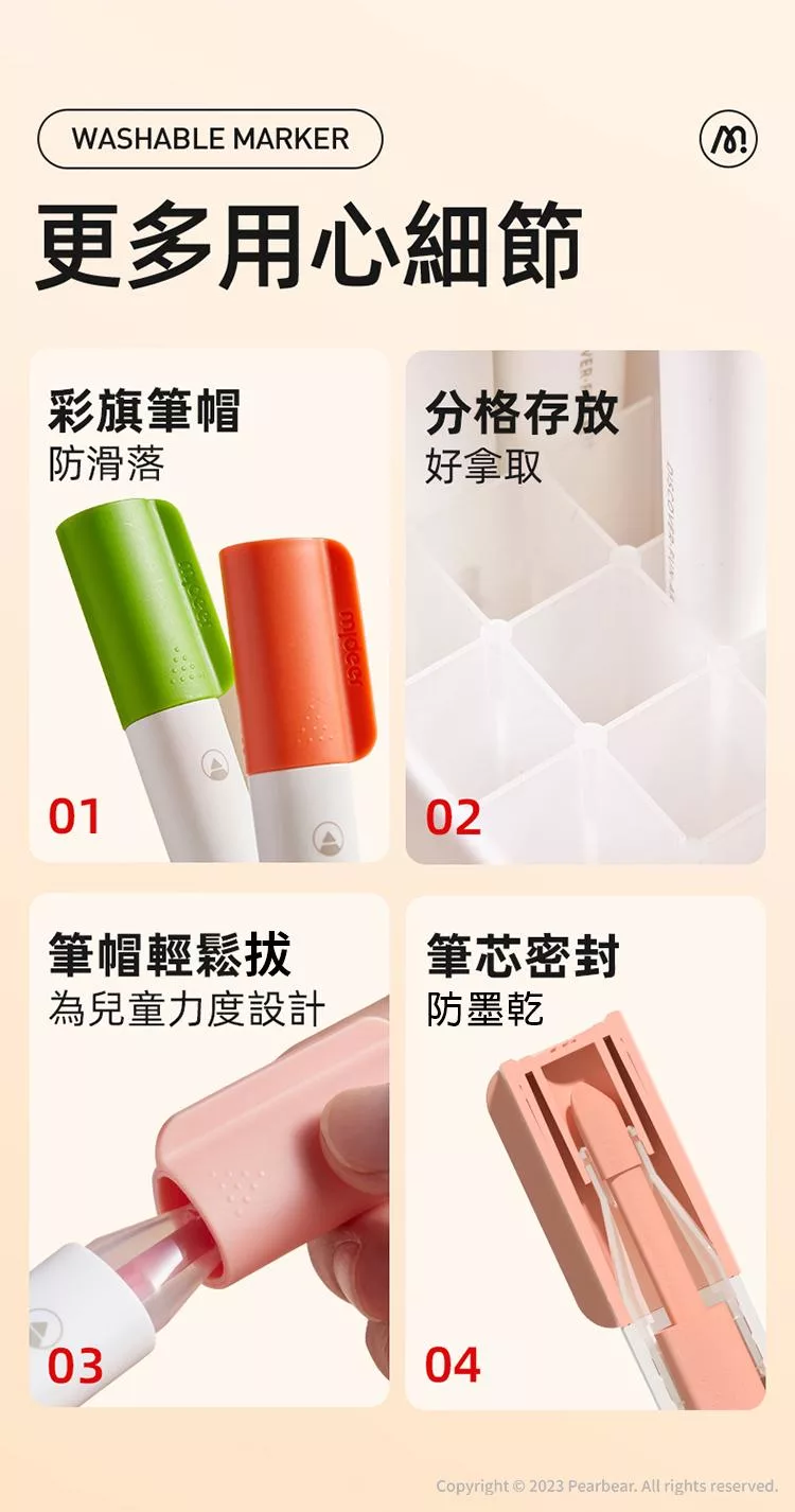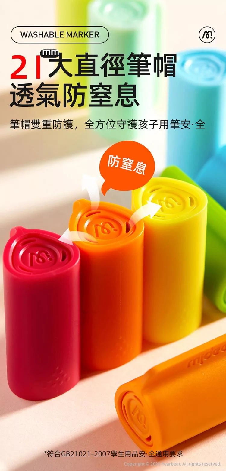 可洗彩色筆是一系列非常適合孩子創作的水性彩色筆,擁有亮麗的彩虹配色,可以啟動孩子對色彩的感知力。不僅色彩飽滿不褪色,還可用清水輕鬆清洗顏料,不怕孩子的「即興創作」!水洗度創新高!從墨水到筆桿全面專為兒童繪畫研發。全新的安全墨水,通過國外認證的各項檢測,確保使用安心,給孩子安全保障。其中96.5%的顏色都可以輕鬆溶解,不留痕跡。該配方經過全新水洗墨研發,可在溫水下獲得更高的水洗度,衣物和皮膚都可以輕鬆清洗乾淨。“口紅”筆頭點、線、面輕鬆切換,一支筆體現多種繪畫技巧。“口紅”筆頭:更符合3-6歲兒童繪畫握筆角度與力度,點、線、面,輕鬆創作。這款筆通過了“UL環境聲明驗證”,所使用的材質對環境友善,通過綠色環保檢測。此外,這款筆的墨量高出標準4倍,一支可以多畫300公尺!加大筆芯筆頭接觸面,出墨流暢均勻,一筆順滑到底。漸變粗三角筆桿:為正確握筆姿勢訂製,筆桿採用三角到圓桿漸變設計,重心偏下更好引導正確握筆姿勢。這款筆的色彩體系是由大師級藝術家配色,結合明度及色相進行細分,以兒童繪畫習慣及顏色認知為基準,建構Mideer大師級色彩體系。筆芯具有高抗壓特性,大力戳也不易內縮。筆帽採用21 mm大直徑設計,透氣防窒息。雙重防護,全方位守護孩子用筆安全,符合學生用品安全通用要求。還有更多用心細節,如彩旗筆帽防滑落、分格存放好拿取、筆帽輕鬆拔、筆芯密封防墨乾等。外包裝擁有手提盒、筆筒、收納功能,非常實用。