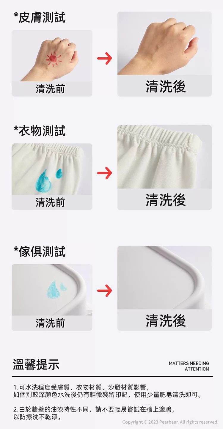 1.可水洗程度受膚質、衣物材質、材質影響,如各別較深顏色水洗後、仍有輕微殘留印記,可使用肥皂清洗即可。